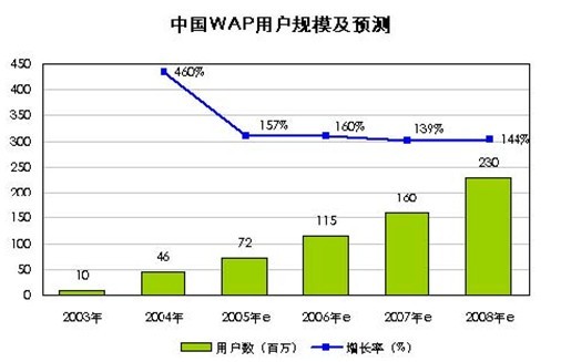 中國WAP 用戶數在2003 年只有900 萬,到2004 年用戶數增長了四倍多,達到4600萬戶,隨著2004 年運營商政策的調整,2005 年WAP 用戶數的增幅將趨緩,用戶規模達到7200 萬戶,主要是免費WAP 應用的增多保證了用戶增長的速度,到2008 年中國WAP用戶規模已經達到2.3 億戶。預計到2009 年中國WAP用戶規模將達到4 億戶。